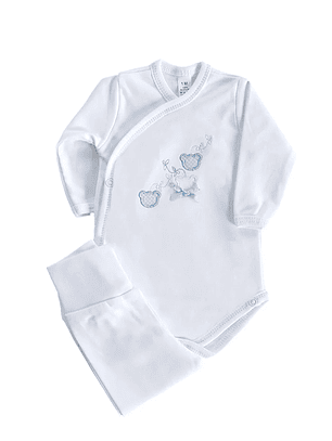 Disponível nos tamanhos 1 mês (50-55 cm), 3 meses (56-61 cm), 6 meses (62-67cm), 9 meses (68-72cm), 12 meses (73-78 cm), 18 meses (79-84 cm) e 24 meses (85-91)
